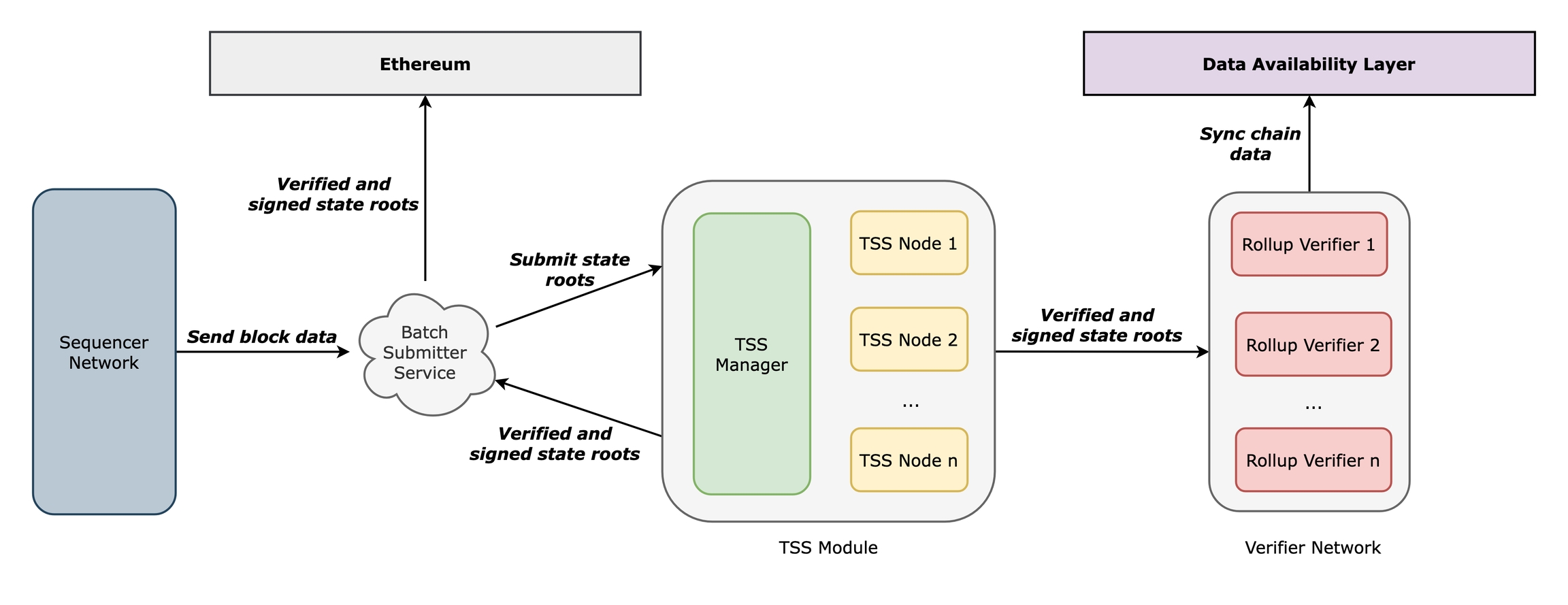 Because TSS nodes re-derive the state root, we alternatively refer to signed state roots generated by TSS nodes as the execution result.When the execution result determines that the state root is valid — and can be uploaded to L1 — it is passed back to the Batch Submitter by the TSS Manager.Each TSS client runs a Verifier (that sync data from United Protocol DA) so it can execute transactions and arrive at the correct state root. This state root (the execution result) is used to verify the event data coming from the TSS manager.